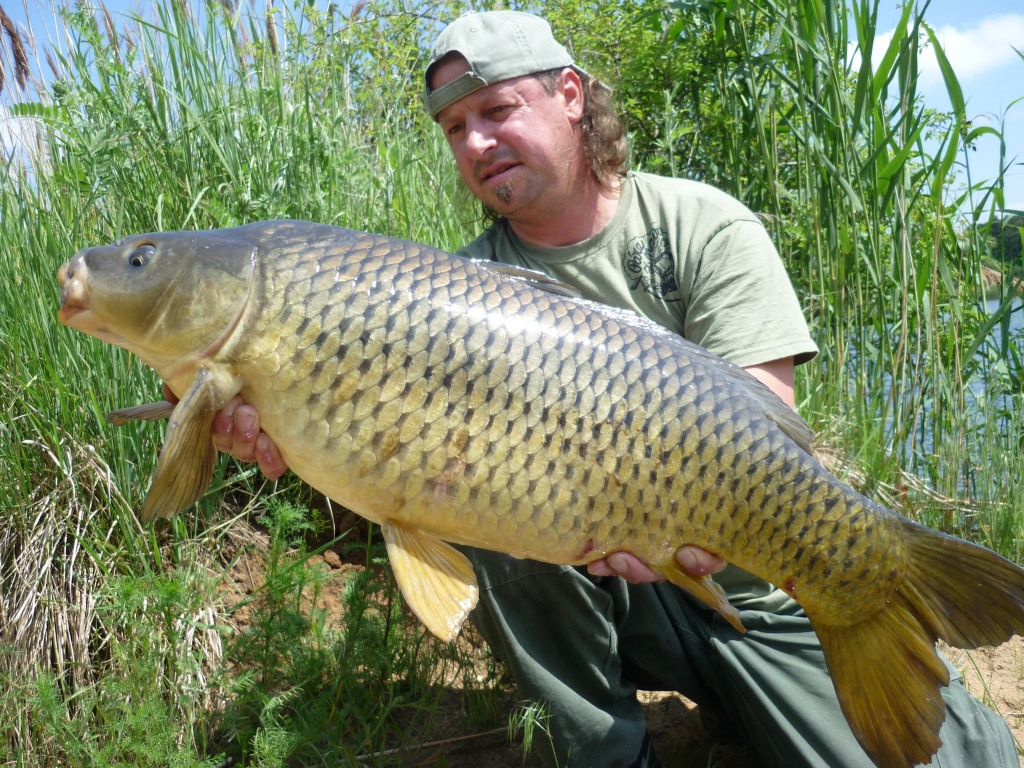 To že jsou na pískovně velké ryby jsem se přesvědčil na vlastní kůži ve středu ráno cca v 2:30hodin. Nádherný záběr na dvě koule o průměru 17 monster crab - ananas. Po 10 minutách souboje mi ryby zajela k rákosí, kde se o stonek zasekla. Skočil jsem do člunu a honem za rybou. Podběrák bohužel zůstal na břehu a kluci si opodál chrupkali v bivaku. Díky čisté vodě, která na této pískovně je jsem spatřil nádherného kapříka cca 20kg a možná i víc. Byl omotaný kolem jednoho stonku. Já rozmotával a řval na kluky, aby mi hodili podběrák. Bohužel než kluci přiběhli, kapr zabral a u dělalo to jen pink u háčku a bylo po kaříkovi. S toho vyplívá "na člun pro rybu, vždy s podběrákem :-))))".